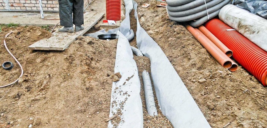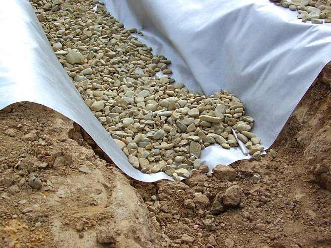 Геотекстиль укладывается на дно и стенки траншеи с нахлёстом. Он предотвращает заиливание дренажных труб и увеличивает срок службы системы.
